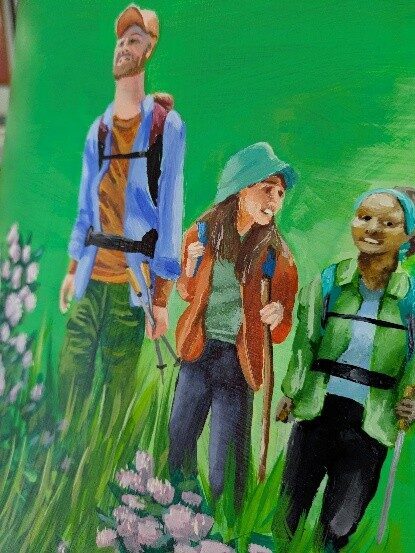 The illustration of hikers gives a nod to the many established trailways which can be enjoyed throughout the county, including the famed Appalachian Trail (AT) that brings many visitors through the area annually,